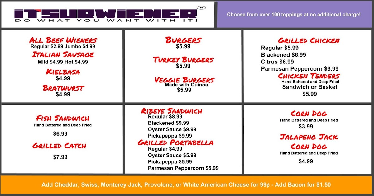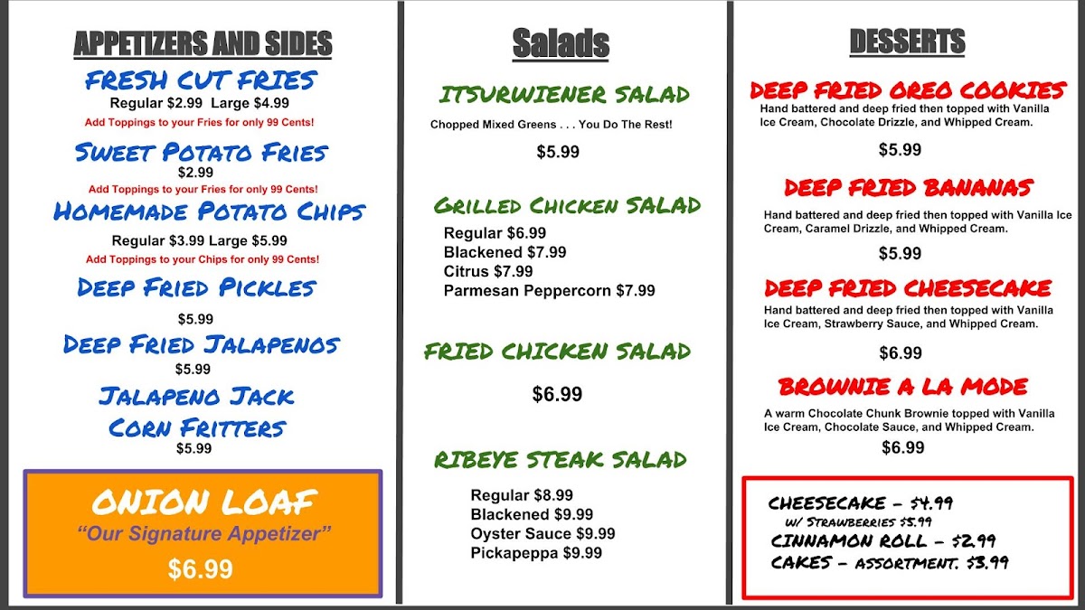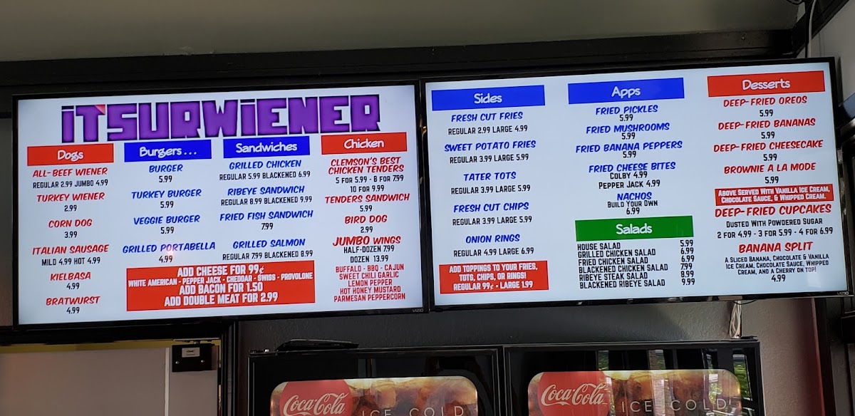 Welcome to ITSURWIENER Restaurant and Bar, where culinary creativity meets hearty comfort! Located at 101 Keith St, Clemson, SC, this vibrant eatery offers a diverse menu that will tantalize your taste buds. From mouthwatering burgers like the Pizza Burger loaded with fried mozzarella and marinara sauce to the indulgent Deep Fried Cupcakes, each dish is crafted to perfection.